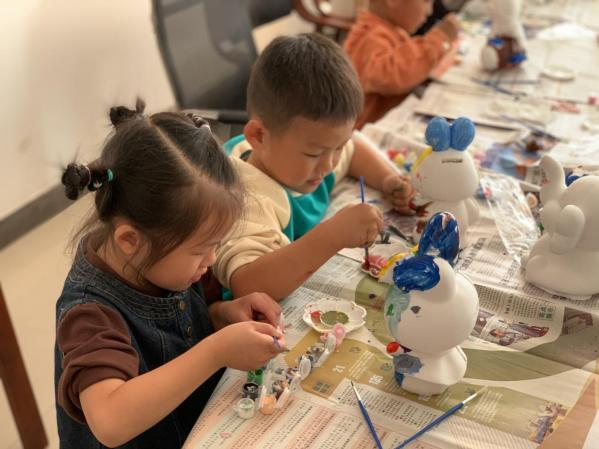 帅气英勇的宇航员、调皮可爱的大象、憨态可掬的小狗……“石膏娃娃”彩绘活动受到小年龄段儿童的喜爱,小朋友们在老师的带领下,学习制作流程、注意事项及色彩运用的技巧,拿起画笔,用斑斓色彩为石膏娃娃“上妆”。