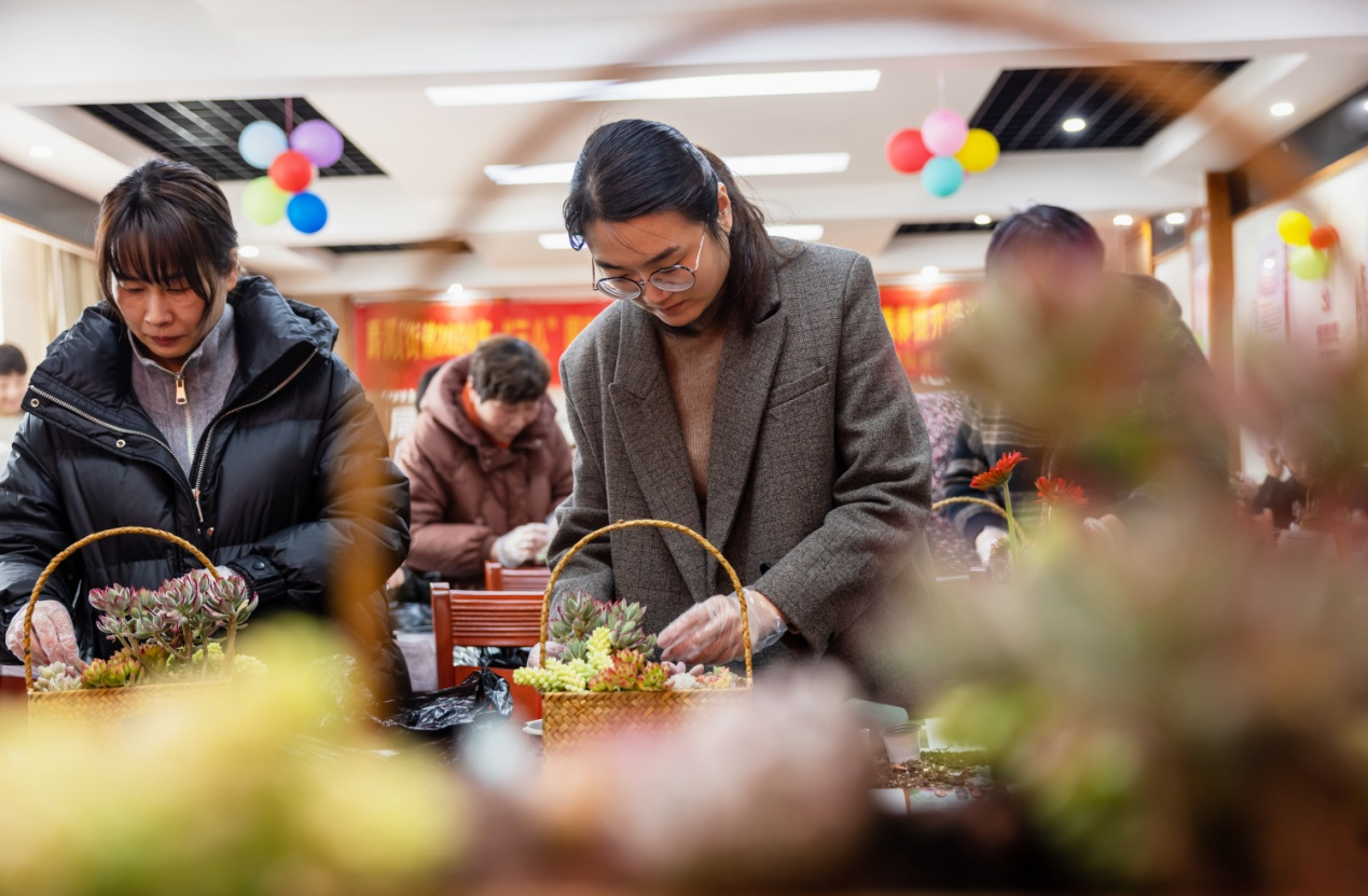 纪念大会后,动还邀请绿盛园艺的园艺师现场教授多肉植物养护知识和栽培技巧。园艺师先从多肉的栽培技巧、光照要求、浇水要点、注意事项等方面进行详细讲解,随后在园艺师的指导下,大家手持工具,在花篮里放满多肉专用营养土,在花篮内找好位置种下多肉,填土压实后铺上一层火山石,点缀上小巧可爱的装饰品。在欢声笑语中,一盆盆可爱的多肉盆栽呈现在大家面前,每个人脸上都洋溢着幸福的气息。