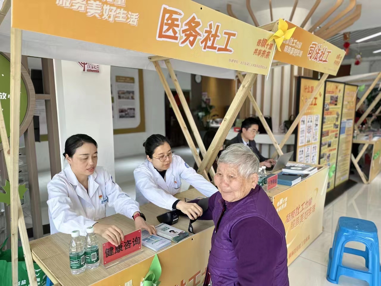 大厅内,鹅黄色的温馨色调映入眼帘,仿佛将整个春天的温暖都凝聚在了这里。展板上插满了黄色、绿色的风车,随着微风的吹拂,它们轻轻转动,发出悦耳的声音,仿佛在诉说着春天的故事。背景墙上,醒目的“凝聚社工力量,服务美好生活”的主题标语格外引人注目,它传递着社工们为枫林社区创造美好生活的坚定信念。 居民会客厅宽敞的空间里,精心设置了五个各具特色的摊位,它们如同五彩斑斓的拼图,共同拼凑出一幅社工服务的壮丽画卷。这些摊位不仅充分展示了社工行业的多元性,也为企业嘉宾与共建单位们提供了一个互动、学习和交流的绝佳平台。 首先映入眼帘的是金融社工摊位,这里的北仑农商银行浃江支行的金融社工们热情洋溢,他们通过生动的案例和深入浅出的讲解,向公众普及电信反诈知识,宣传银行金融助企政策。