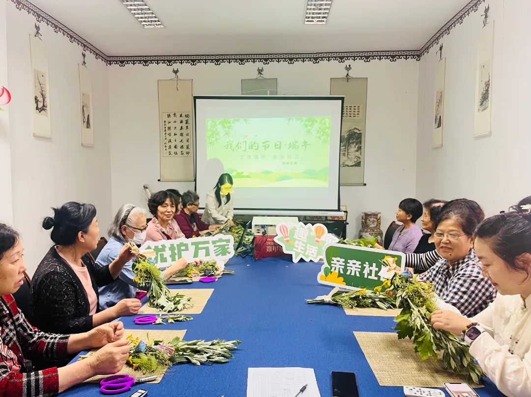 亲亲社区妇联以党建引领,联合优护万家开展了“端午花开 粽情一夏 ”端午主题活动,社区组织辖区妇女10余人参加活动,感受端午节丰富的历史文化内涵。 “五月五,过端午,悬艾草,插香蒲……”老师,用生动幽默的语言和提问互动等方式向大家介绍了爱国诗人屈原和端午节的渊源,了解了吃粽子、划龙舟、挂香囊等与端午相关传统习俗,居民踊跃互动,热情高涨。 制作艾草花束,意蕴着驱邪纳福、吉祥安康。大家积极发挥动手能力,将艾草打底,依次错开搭配菖蒲叶等,扎上五彩的绳子,系上艾草香囊,一束束散发悠悠香气、寓意幸福美好的艾草花束绽放在了大家的手中。 一年一端午,一岁一安康。亲亲社区将继续以“我们的节日”主题活动为载体,积极开展形式多样、内容丰富的文明实践活动,持续为居民搭建更多交流互动的平台,深化传承中华优秀传统文化,共同营造和谐美好的社区氛围。