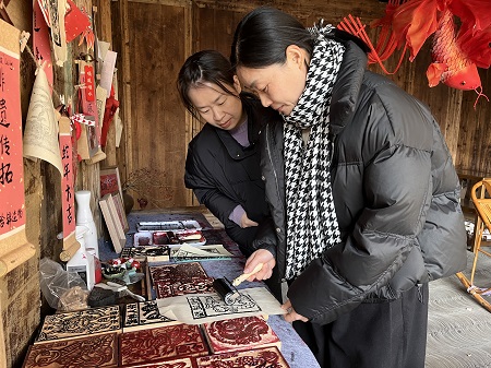 另外一组体验非遗拓印,拓印技艺凝聚着古代匠师们的智慧结晶,是中华民族传统文化宝库中的一颗璀璨明珠。现场展示的精美拓印作品,以其独特的艺术魅力,迅速吸引了女干部职工的目光,大家纷纷对这项传统技艺表现出浓厚的兴趣。在老师的指导下,大家认真地进行拓板、沾墨、按压等操作,沉浸在创作的乐趣中。墨汁的晕染下,碑文、拓板上的文字或图案逐渐清晰呈现在宣纸上,展现出独特的艺术韵味,现场气氛热烈而欢快。